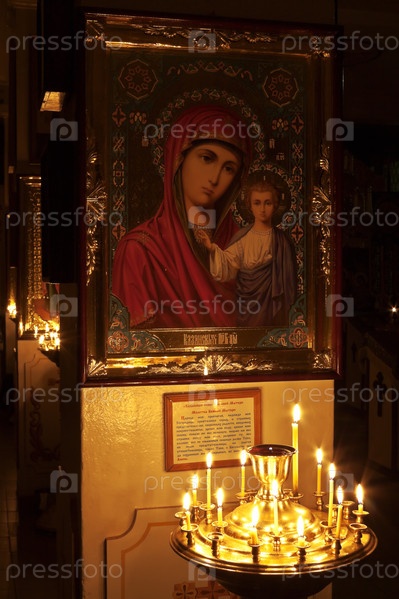 Церковный подсвечник с горящими свечами и лампадой у иконы Богородицы