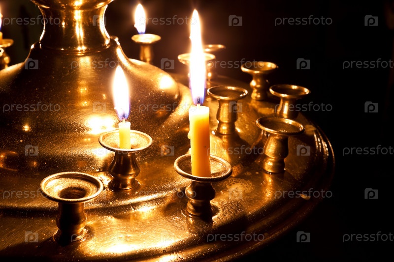 Церковный подсвечник с горящими свечами в ночном храме
