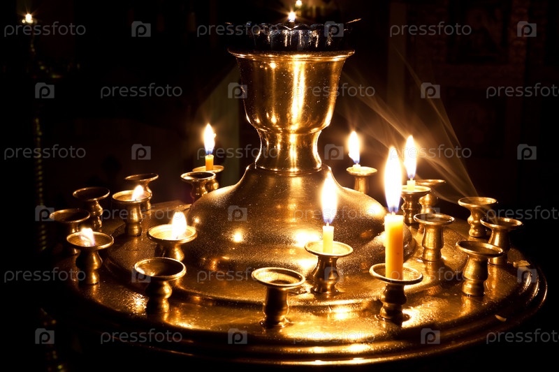 Церковный подсвечник с горящими свечами и лампадой в ночном храме