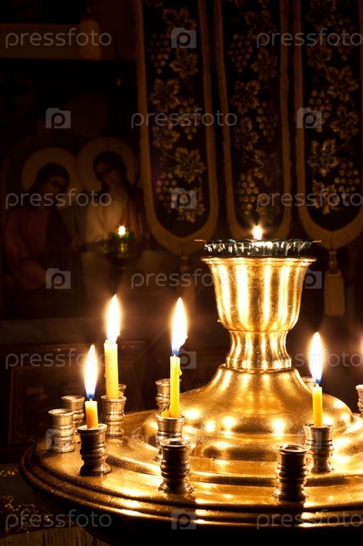 Церковный подсвечник с горящими свечами и лампадой в ночном храме