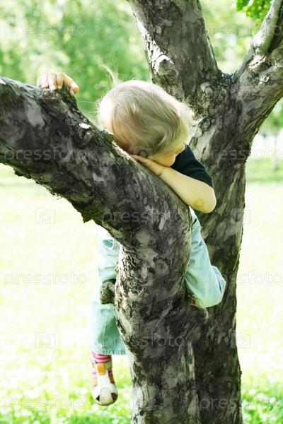 Маленький мальчик спит на ветке дерева