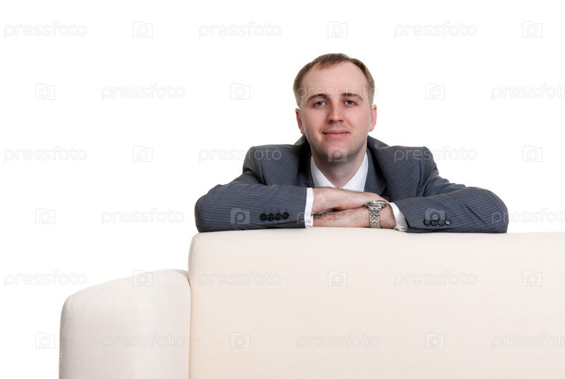 Бизнесмен на диване, на белом фоне