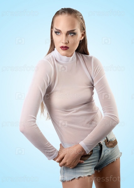 Модель с длинными светлыми волосами и ярким профессиональным макияжем. На синем фоне