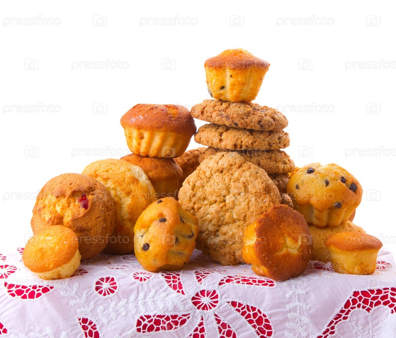Выпечка на столе на белом фоне