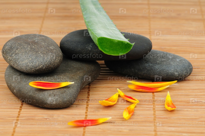 Камни, лепестки цветов и алоэ на деревянном фоне