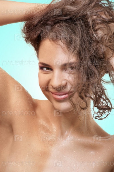 Портрет девушки с различным загаром на голубом фоне