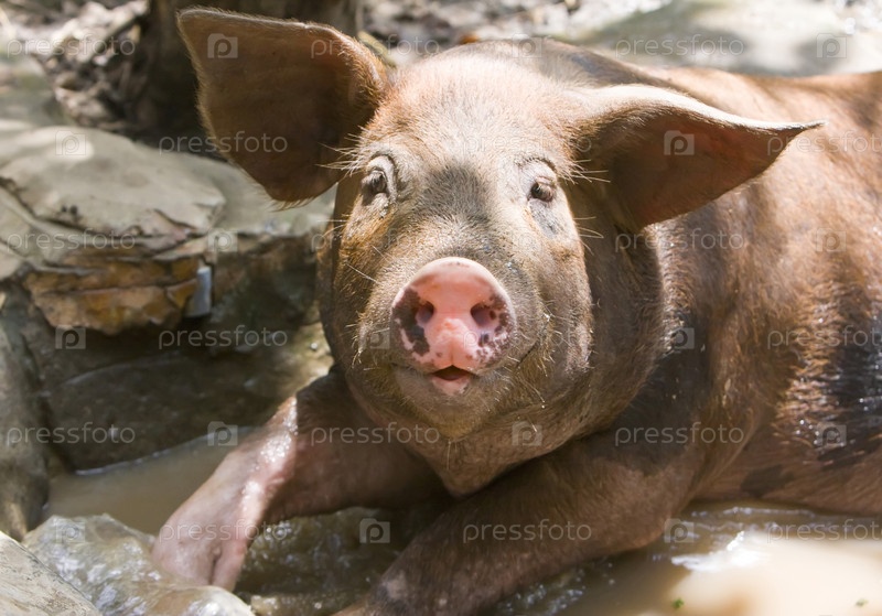 Симпатичная свинка лежит в луже