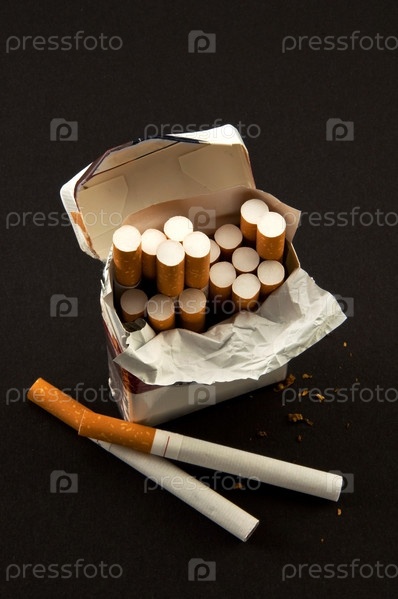 Уродливые открытые пачки сигарет и табачные крошки на черном фоне