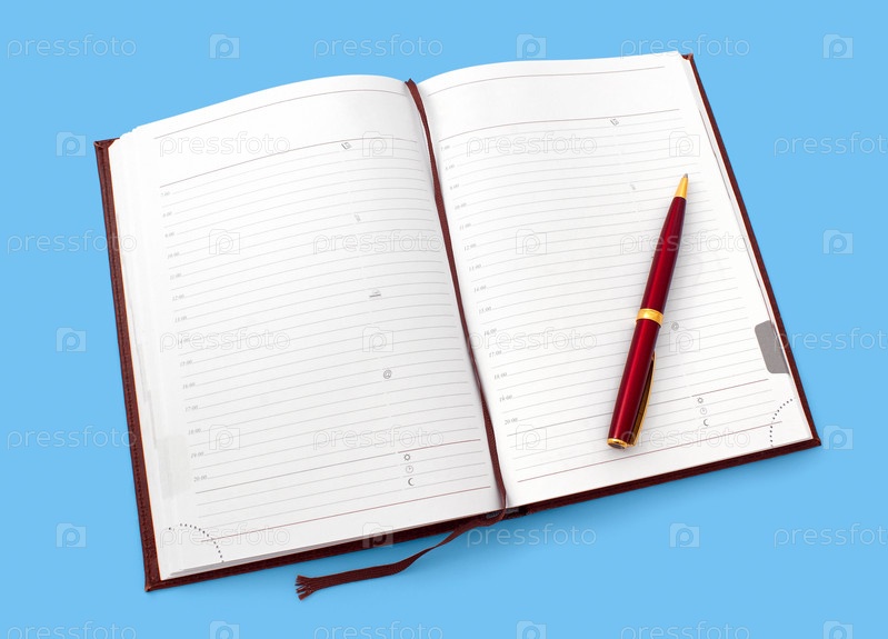 Открытый ежедневник и шариковая ручка на голубом фоне