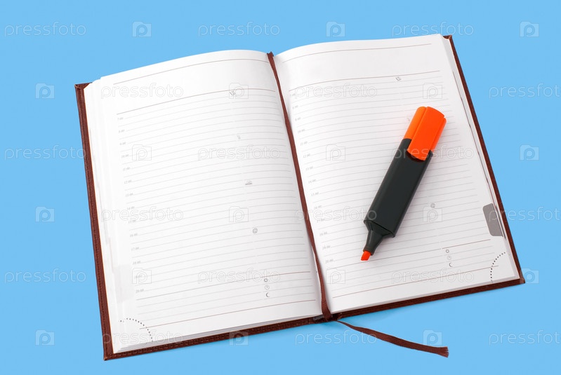 Открытый ежедневник и текстовый маркер на голубом фоне