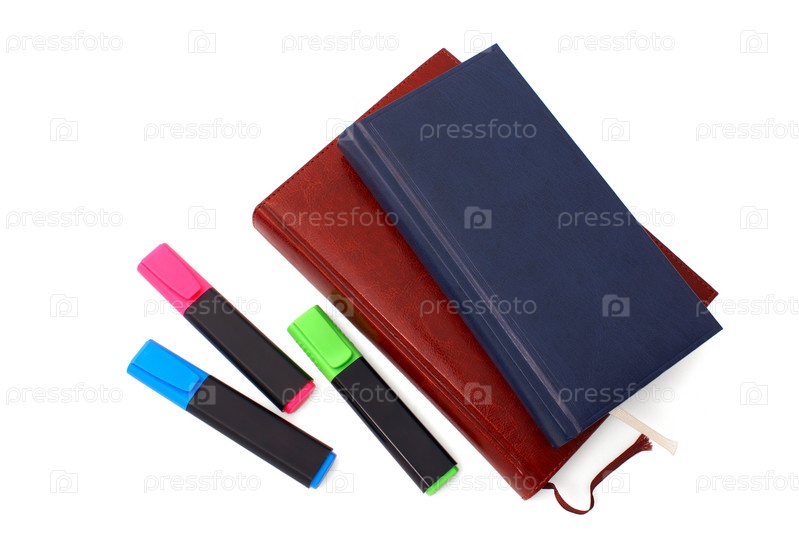 Два ежедневника в кожаных обложках и три текстовых маркера на белом фоне