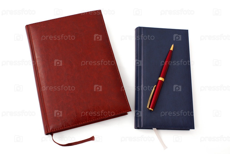 Два ежедневника в кожаных обложках и шариковая ручка на белом фоне