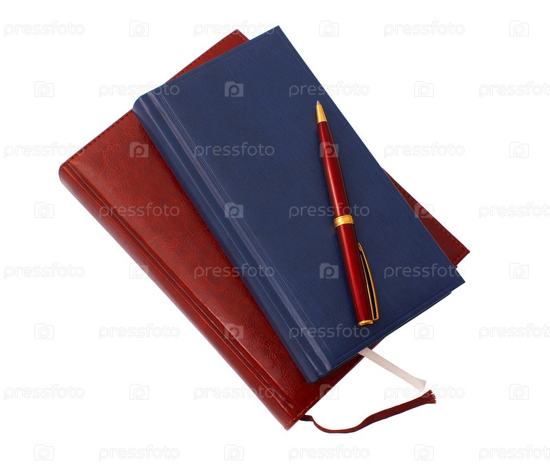 Два ежедневника в кожаных обложках и шариковая ручка на белом фоне