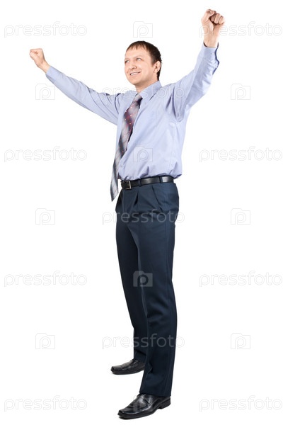 Портрет счастливого бизнесмена с поднятыми вверх руками, радующегося победе, на белом фоне