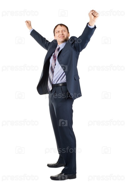 Портрет счастливого бизнесмена с поднятыми вверх руками