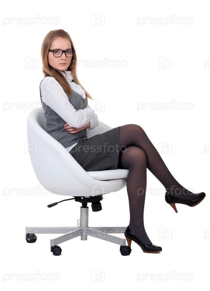 Молодая бизнес-леди в очках сидит в кресле. Белый фон