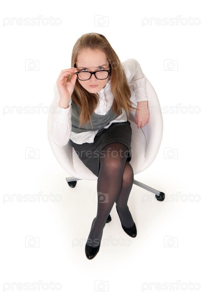 Молодая бизнес-леди в очках сидит в кресле. Белый фон