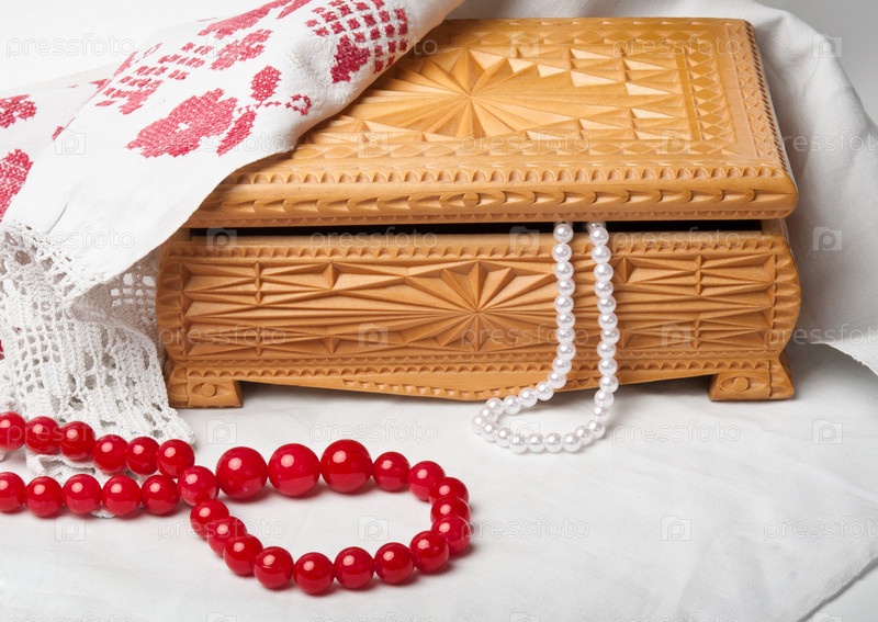 Деревянная резная шкатулка с бусами на вышитой салфетке
