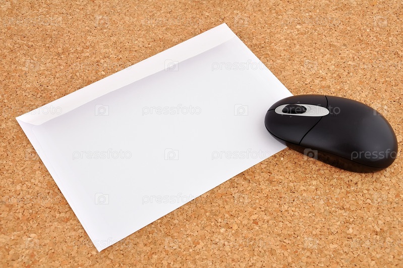 Беспроводная мышь и конверт на поверхности из пробки