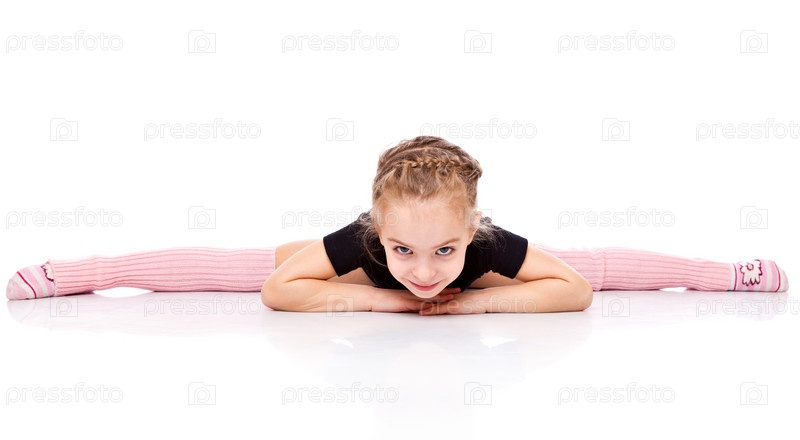 Девочка сидит на шпагате. Изолирована на белом фоне