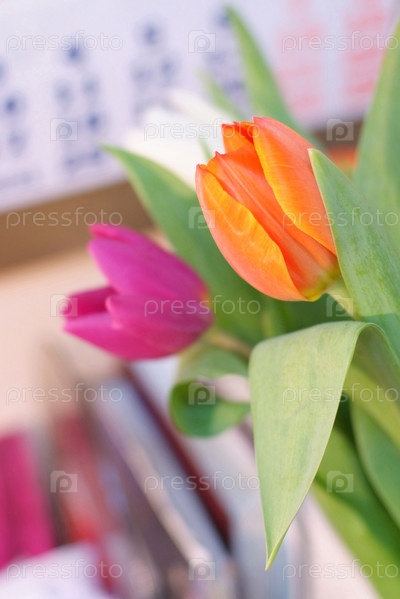 Красные, белые и оранжевые тюльпаны на фоне офисного календаря