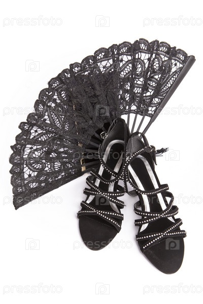Женские босоножки, сумочка и веер, изолированные на белом фоне