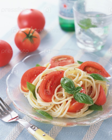 Спагетти с томатами, украшенные зеленью