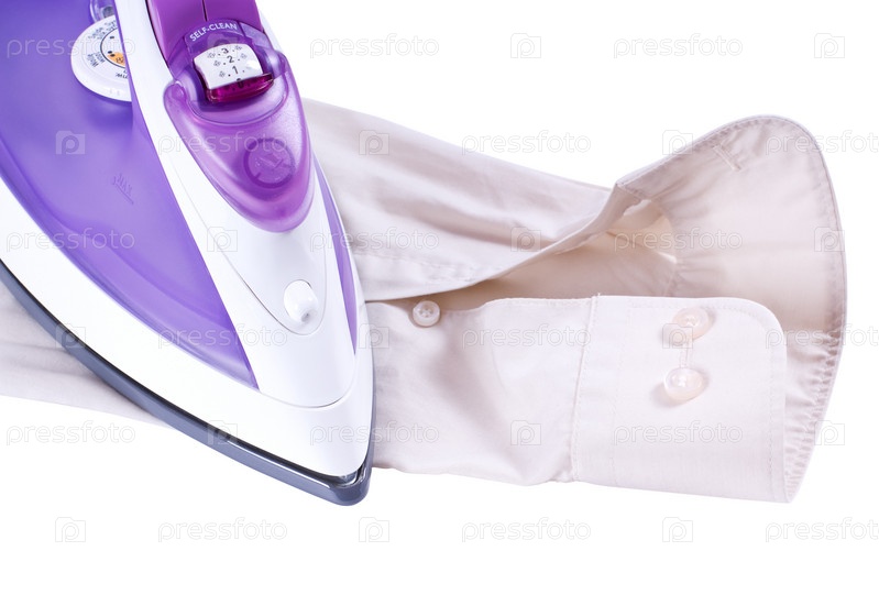 Фиолетовое и белое сглаживающее железо на бежевой рубашке изолировано
