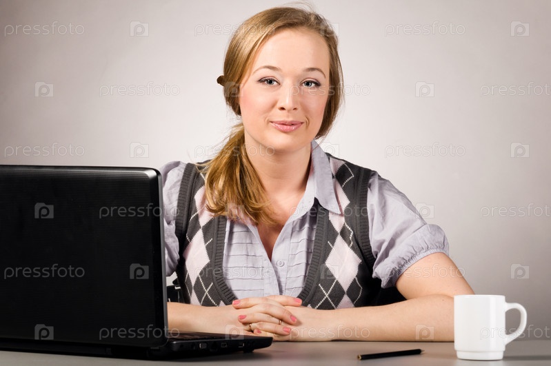 Красивая девушка работает на ноутбуке