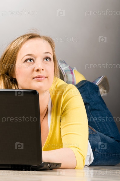 Красивая девушка работает за ноутбуком