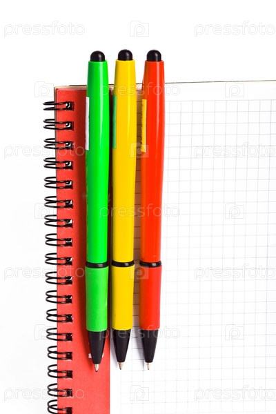 Блокнот и цветные ручки, изолированные на белом фоне