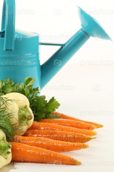 Овощи и лейка на белом фоне