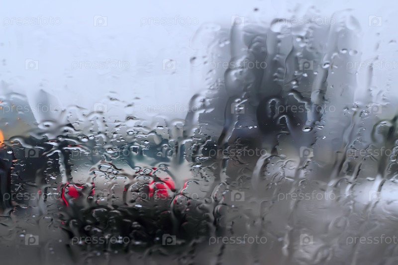 Вид на городскую улицу через залитое дождем окно автомобиля