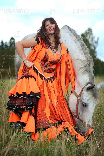 Цыганская девушка в поле с лошадью