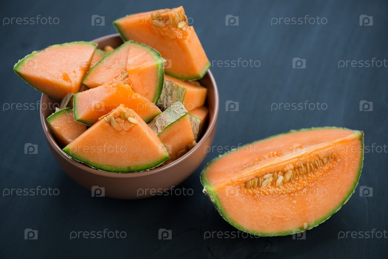 Нарезанная дыня-канталупа на темном деревянном фоне