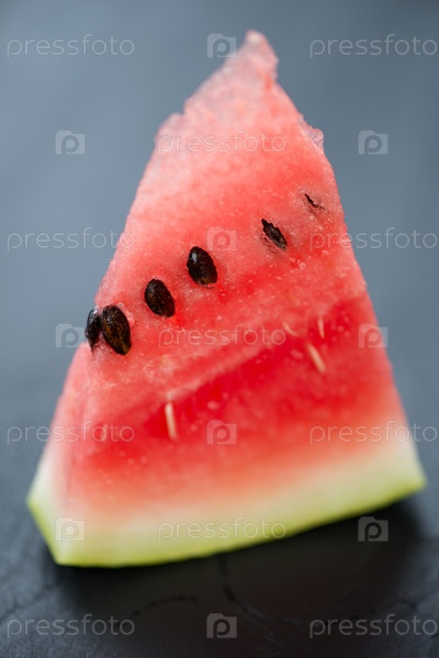 Ломтик спелого арбуза на темном деревянном фоне
