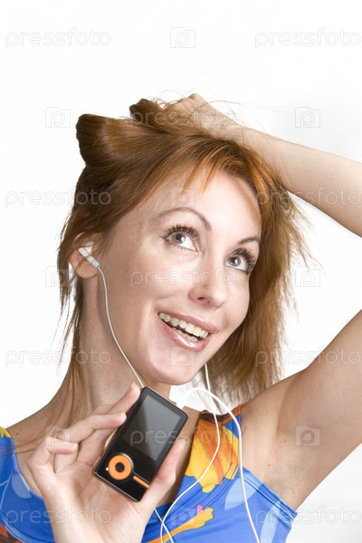 Радостная женщина слушает музыку в наушниках
