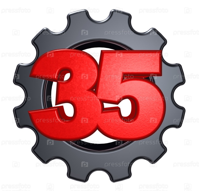 Число 35 и зубное колесо на белом фоне - 3d иллюстрация