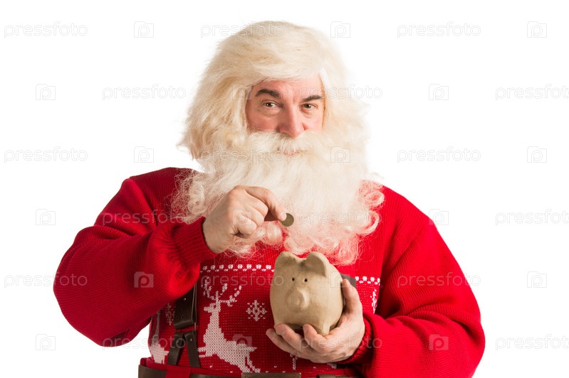 Санта-Клаус кладет золотую монету в копилку