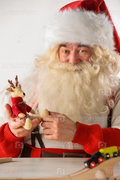 Санта-Клаус делает новые игрушки в мастерской