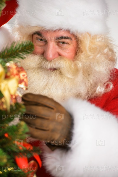 Санта Клаус украшает Рождественскую елку
