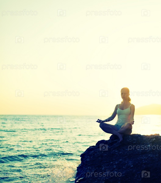 Женщина медитирует в позе лотоса на пляже