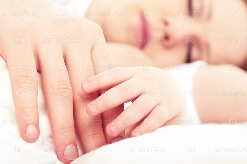 Рука спящего ребенка в руках матери
