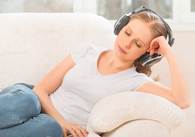 Женщина в наушниках наслаждается музыкой, лежа на диване у себя дома