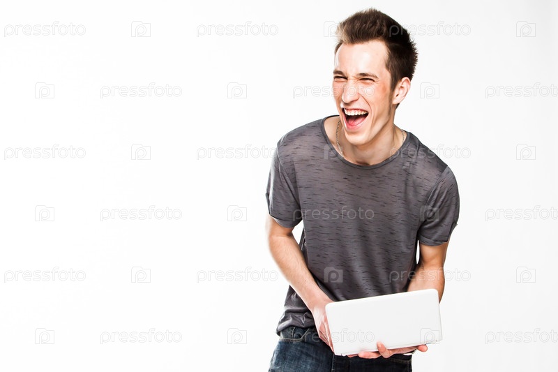Молодой и симпатичный мужчина с белым ноутбуком