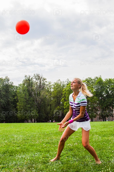 Молодая и красивая женщина играет в волейбол