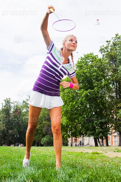 Красивая и молодая женщина играет в бадминтон