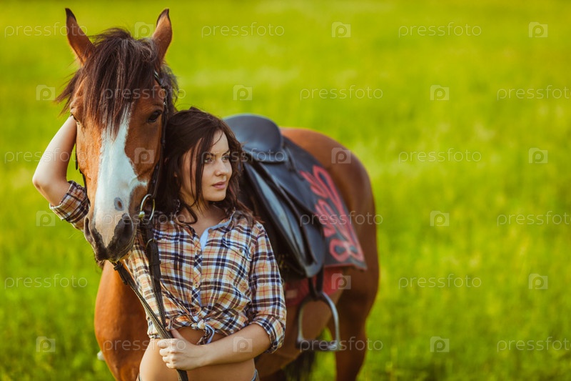 Женщина позирует с лошадью
