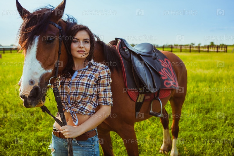 Женщина позирует с лошадью