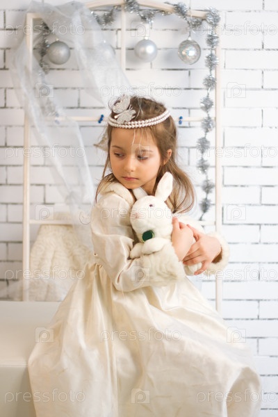Девочка в зимнем праздничном платье с игрушечным кроликом